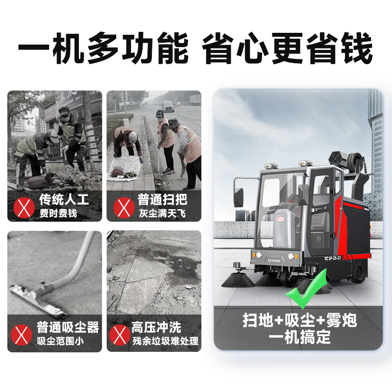 室外驾驶式扫地车扫地/吸尘/排喷,每小时清扫21000㎡,清扫宽度2100mm,续航时间4-5h,后排喷前喷雾双功能,不用担心满天的灰尘。